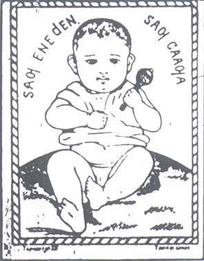 1928 1928(?) г. Разм. 50 х 67 мм. Одноцветная печать на кремовой бумаге. В центре в декоративной прямо-угольной рамке разм. 47 х 61 мм сидящий ребенок с погремушкой в руке. Сверху текст на местном языке латинской графикой. Внизу под рамкой мелким шрифтом выходные данные: «Турклит №37 Тираж 20000».