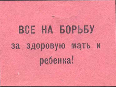 1924 1924(?) г. Разм. 62 х 47 мм. Одноцветная печать на розовой бумаге. В центре текст в три строки: «Все на борьбу за здоровую мать и ребенка!».