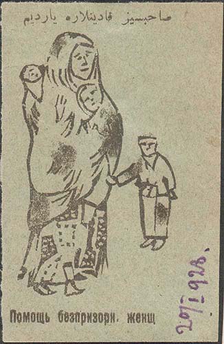 1928 1928 г. 20.01.1928 г. Разм. 54 х 83 мм. Одноцветная печать низкого качества на тонкой зеленой бумаге. В центре изображение женщины с тремя детьми. Сверху текст на азербайджанском языке арабской графикой. Внизу текст: «Помощь беспризорн[ым]. Женщ[инам].».