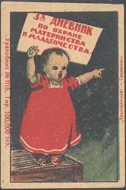 1925 1925(?) г. Разм. 41 х 62 мм. Трехцветная печать на белой бумаге. В прямоугольной рамке размером 35 х 56 мм ребенок, стоящий на стуле с поднятыми рука-ми. Сверху плакат с текстом в четыре строки: «З-х дневник по охране материнства и младенчества». Слева сверху вниз мелким шрифтом выходные данные: «Уралоблит №1115. Тир. 100000 экз.».