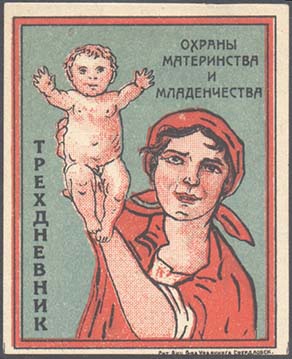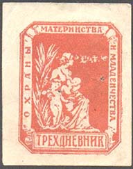 1926 1926(?) г. Разм. 31 х 39 мм. Одноцветная печать на белой бумаге. В декоративной восьмиугольной рамке в виде ленты разм. 24,5 х 31,5 мм женщина с ребенком на фоне восходящего солнца и индустриального пейзажа. На ленте текст: «Трехдневник охраны материнства и младенчества».
