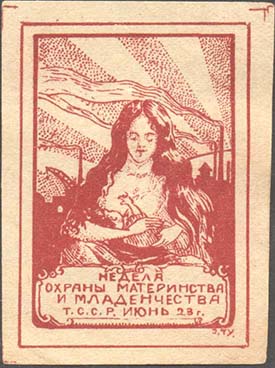1923 1923 г. Июнь Разм. 45 х 61 мм. Одноцветная печать на желтоватой бумаге. В двойной прямоугольной рамке разм. 39 х 55 мм женщина, кормящая ре-бенка грудью на фоне восходящего солнца и завода. Внизу текст в четыре строки: «Неделя охраны материнства и младенчества Т.С.С.Р. Июнь 23 г.».