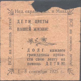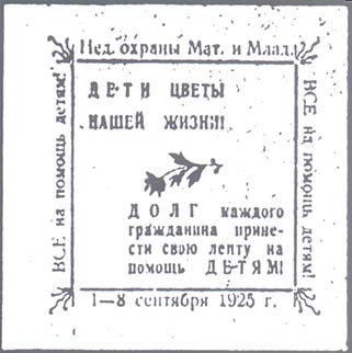 1925 1925 г. 01.-08.09.1925 г. Разм. 54 х 54 мм. Одноцветная печать на желто-оранжевой бумаге. В прямоугольной рамке разм. 37 х 37 мм с декоративными элементами по углам в центре букет цветов. Сверху текст в две строки: «Дети цветы нашей жизни!». Внизу текст в четыре строки: «Долг каждого гражданина принести свою лепту на помощь детям!». По наружному периметру рамки текст: «Все на помощь детям! Нед[еля]. Охраны Мат[еринства]. и Млад[енчества]. Все на помощь детям! 1-8 сентября 1925 г.».