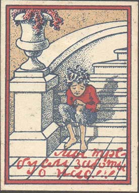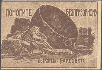 1924 1924(?) г. Разм. 55 х 38 мм. Одноцветная печать на желтоватой бумаге. В прямоугольной рамке двое беспризорных, развалины и большой котел. Сверху текст: «Помогите беспризорному». Внизу текст: «Детком[иссия]. при Баксовете».