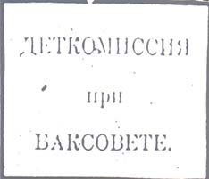 1924 1924 г. Разм. 40 х 33 мм. Одноцветная печать на плотной серо-голубой бумаге. В центре текст в три строки: «Деткомиссия при Баксовете».