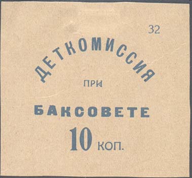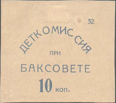 1924 1924(?) г. Разм. 65 х 58 мм. Одноцветная печать на желтоватой бумаге. В центре текст в три строки: «Деткомиссия при Баксовете». Внизу номинал. В правом верхнем углу цифра 32.