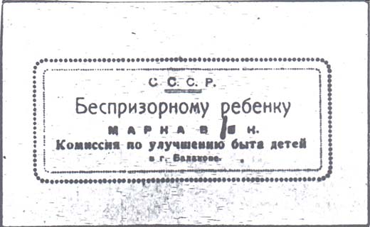1924 1924(?) г. Разм. 87 х 54 мм. Одноцветная печать на бумаге различных цветов. В центре в двойной рамке с закругленными краями текст: «Беспризорному ребенку». Сверху аббревиатура «С.С.С.Р.». Ниже текст в три строки: «Марка в ... к. Комиссия по улучшению быта детей в г. Балаково».