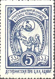 1924 1924 г. Разм. рамки 25,5 х 36 мм. Одноцветная печать на белой бумаге. Зубц. 11 1/2. С клеем. В центре в двойной прямоугольной рамке декоративная овальная рамка, в которой женщина протягивает руки двум детям. Сверху герб Аджарии. Сверху на ленте текст в две строки на грузинском языке. Внизу в круглой рамке номинал. Внизу под рамкой текст: «Деткомиссия при Ц.И.К. Аджар[ии].».