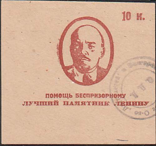 1933 1933 г. Разм. 88 х 81 мм. Одноцветная печать на толстой кремовой бумаге. В центре в толстой овальной рамке портрет В.И.Ленина. Внизу текст в две строки: «Помощь беспризорному лучший памятник Ленину». В правом верхнем углу номинал: «10 к.». Справа черный оттиск круглой печати с текстом по окружности: «Белгородское Городское О-во «Друг детей»». В центре печати аббревиатура «О.Д.Д.».