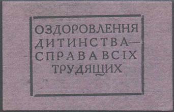 1933 1933 г. 08.04.1933 г. Разм. 37 х 56 мм. Одноцветная печать на темно-сиреневой толстой бумаге. В центре в прямо-угольной рамке разм. 38 х 27 мм текст в четыре строки на украинском языке: «Оздоровление детей – дело всех трудящихся».