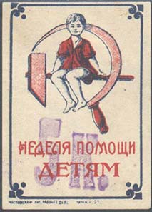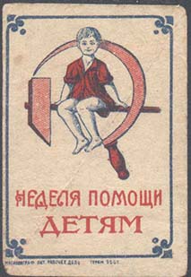 1927 1927 г. 16.05.1927 г. Разм. 35 х 51 мм. Двухцветная печать на белой бумаге. В центре в прямоугольной рамке разм. 31 х 45 мм с орнаментом по углам серп и молот, на рукоятке которого сидит ребенок. Внизу текст в две строки: «Неделя помощи детям». Слева внизу под рамкой мелким шрифтом выходные данные: «Мосполиграф Лит. Рабочее дело. Тираж 200 т».
