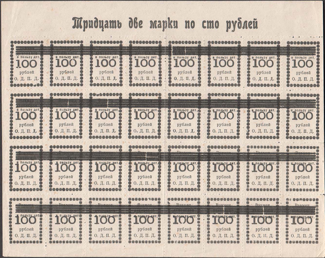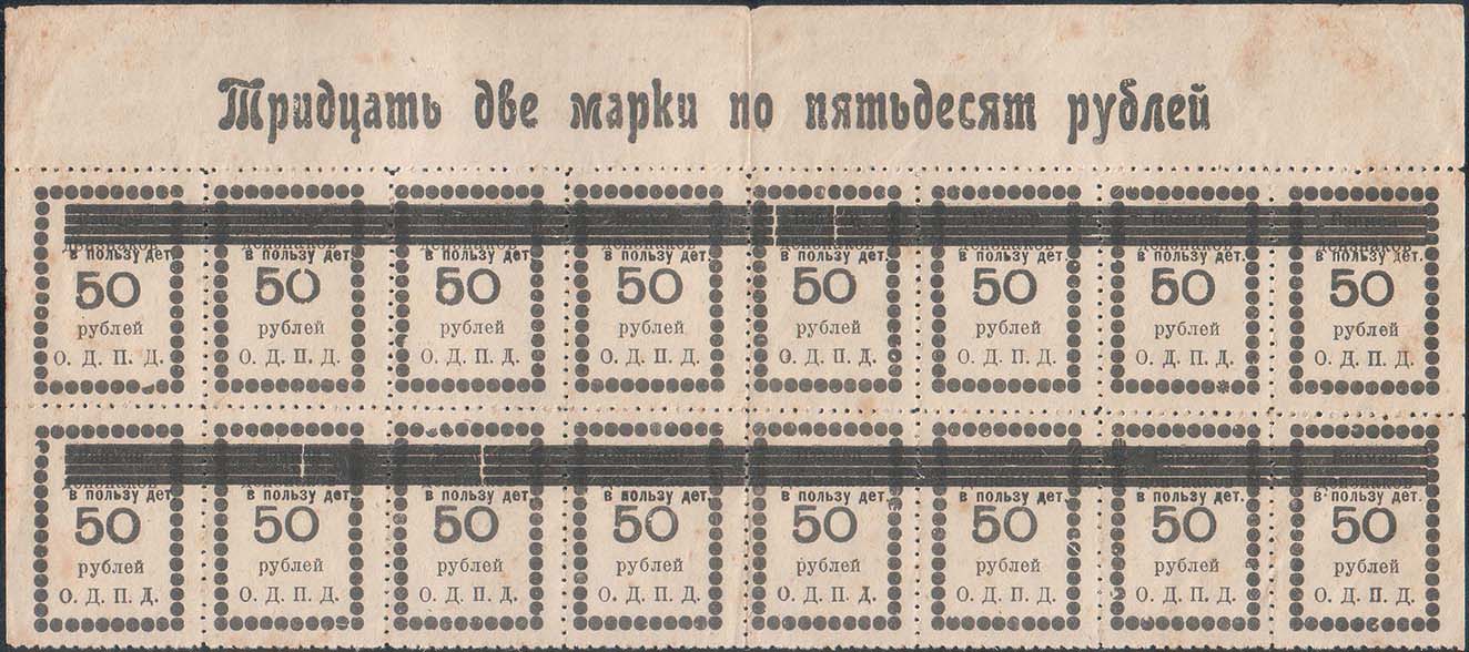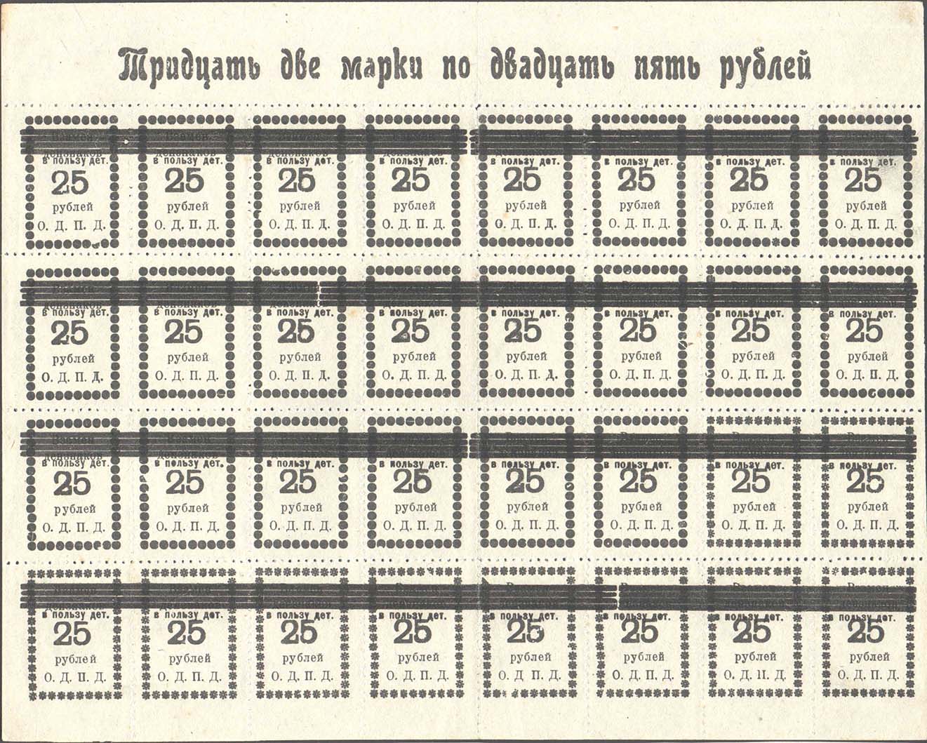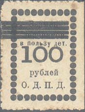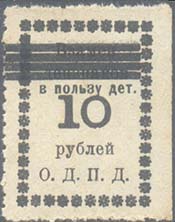 1923 1923 г. Разм. рамки 21 х 30 мм. Одноцветная печать на желтоватой бумаге. Зубц. 10 низкого качества. В рамке сверху текст в две строки: «Взамен дензнаков», забитый четырьмя горизонтальными штрихами. Ниже новый текст: «В пользу дет[ей].». Ниже номинал и буквы: «О.Д.П.Д.».