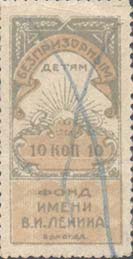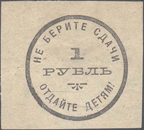 1923 1923(?) г. Разм. 48 х 44 мм. Одноцветная печать на тонкой желтоватой бумаге. В центре в круглой рамке диаметром 35 мм номинал в две строки. Внизу декоративный элемент. По внутреннему периметру рамки тест: «Не берите сдачи. Отдайте детям!».