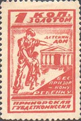 1924 1924 г. Разм. рамки 22 х 33 мм. В прямоугольной рамке в центре рабочий показывает беспризорному ребенку на дом с надписью над фасадом: «Детский дом». Верху номинал в две строки. Внизу текст в две строки: «Приморская губдеткомиссия».