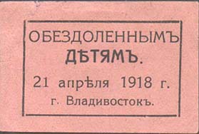 1918 1918 г. 21.04.1918 г. Разм. 48 х 31 мм. Одноцветная печать на светло-розовой бумаге. В центре в прямоугольной рамке разм. 37 х 22 мм текст в четыре строки: «Обездоленным детям 21 апреля 1918 г. г. Владивосток».