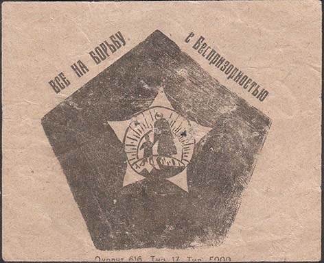 1929 1929 г. 15-17.05.1929 г. Разм. 75 х 65 мм. мм. Одноцветная печать на серой бумаге. В центре рамка в форме пятиугольника разм. 55 х 53 мм. В центре пятиконечная звезда, в центре которой женщина с ребенком на фоне восходящего солнца. Сверху текст: «На борьбу с беспризорностью». Внизу мелким шрифтом выходные данные: «Окрлит 616 Тип.17. Тираж 5000».