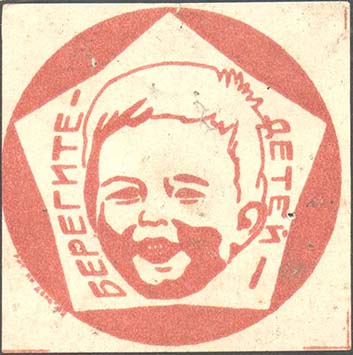 1929 1929 г. 14.-17.04.l929 г. Разм. 59 х 59 мм. Одноцветная печать на желтоватой бумаге. В центре в круге диаметром 57 мм вписана пятиконечная звезда, в центре кото-рой голова ребенка. Текст: «Берегите - детей». Слева с наружной стороны круга неразборчиво выходные данные.