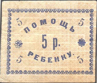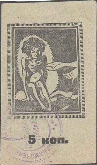 1923 1923 г. Разм. 52 х 88 мм. Одноцветная печать на серо-зеленой бумаге. В центре в двойной декоратив-ной рамке 41 х 52 мм истощенный ребенок, к которому протягиваются руки. Внизу номинал: «5 коп.». На лицевой стороне фиолетовый оттиск круглой печати диаметром 35 мм. На печати текст: «Уполномоченный Деткомиссии по Грозненской губернии».