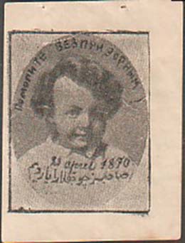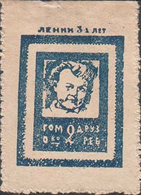 1925 1925(?) г. Разм. 43 х 57 мм. Одноцветная печать на белой бумаге. В центре в прямоугольной рамке разм. 34 х 42,5 мм портрет Володи Ульянова трех лет. Сверху полукругом текст: «Помоготе беспризорным». Внизу текст: «21 апреля 1870». Ниже текст на армянском(?) языке.