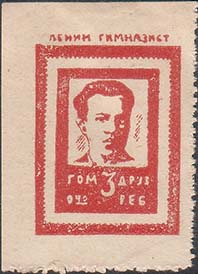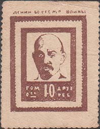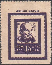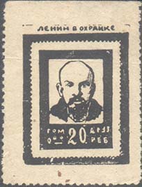 1924 1924 г. Разм. рис. 26 х 32 мм. Одноцветная печать низкого качества на желтоватой бумаге. Зубц. 11 1/2. В центре на сплошном фоне стилизованное изображение марки с портретами В.И.Ленина в различные периоды жизни. Сверху пояснительный текст к портрету. Внизу номинал и текст в две строки: «Гом[ельское]. О-во Друз[ей]. Реб[енка].».