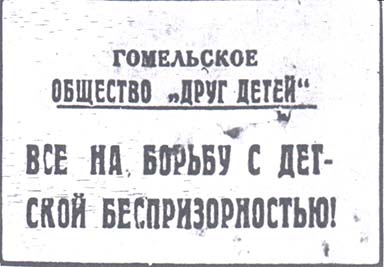 1924 1924(?) г. Разм. 64 х 45 мм. Одноцветная печать на светло-сиреневой бумаге. Сверху текст в две строки: «Гомельское общество «Друг Детей»». Внизу текст в две строки: «Все на борьбу с детской беспризорностью!».