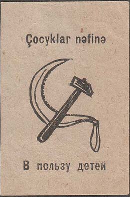 1932 1932 г. Одноцветная печать на серо-зеленоватой бумаге. В центре серп и молот. Сверху текст на азербайджанском языке латинским шрифтом. Внизу текст: «В пользу детей».