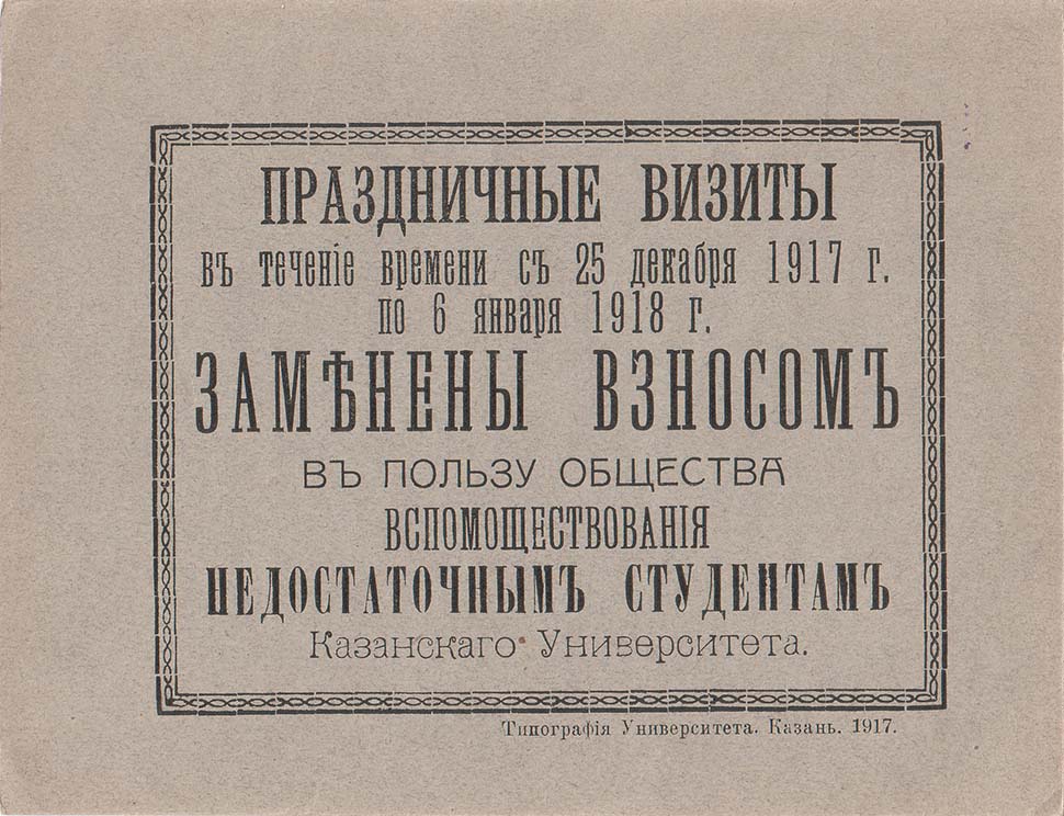 1917 1917 г. Листок разм 164 х 126 мм. Одноцветная печать на плотной серо-зеленоватой бумаге. В двойной прямоугольной рамке разм. 122 х 91 мм текст в восемь строк: «праздничные визиты в течении времени с 25 декабря 1917 г. по 6 января 1918 г. Заменены взносом в пользу общества вспомошествования недостаточным студентам Казанского Университета». Справа внизу под рамкой выходные данные мелким шрифтом: «типография Университета. Казань. 1917».