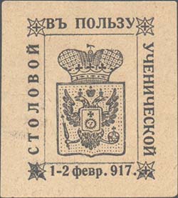1917 1917 г. 01.-02.02.1917 г. Разм. 44 х 49 мм. Одноцветная печать на желтоватой бумаге. В центре в прямоугольной рамке разм. 23 х 32,5 мм герб Каменец-Подольска. По наружному периметру рамки текст: «В пользу ученической столовой 1-2 февр[аля] 917.».