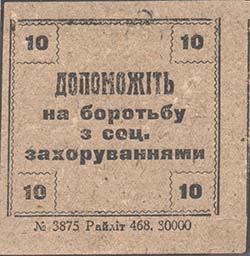 1926 1926(?) г. Разм. 57 х 59 мм. Одноцветная печать на серой бумаге низкого качества. В двойной прямо-угольной рамке разм. 48 х 45 мм в центре текст в четыре строки на украинском языке: «Помогите на борьбу с соц[иальными]. заболеваниями». По углам в волнистых прямоугольных рамках наминал. Внизу под рамкой мелким шрифтом вы-ходные данные на украинском языке: «№3875 Райлит 468. 30000».