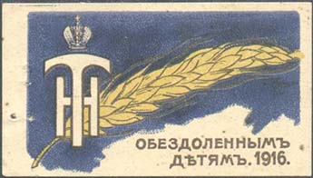 1916 1916 г. Разм. 58 х 32 мм. Трехцветная печать на белой бумаге. Слева эмблема Общества. В центре колос ржи. Справа внизу текст в две строки: «Обездоленным детям. 1916».