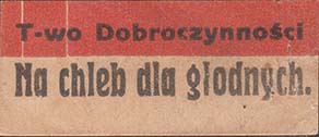1919 1919 г. 08.09.1919 г. Разм. 50 х 21 мм. Двухцветная печать на желтоватой бумаге. На фоне цветов польского флага текст в две строки на польском языке: «Общество(?). На хлеб для голодных».