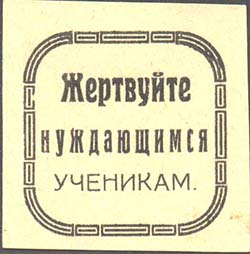 1917 1917(?) г. Разм. 44 х 44 мм. Одноцветная печать на бумаге различных цветов. В декоративной рамке разм. 36 х 36 мм текст в три строки: «Жертвуйте нуждающимся ученикам».