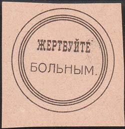 1917 1917(?) г. Одноцветная печать на плотной сероватой бумаге. В центре в круглой рамке из четырех концентрических окружностей диаметром 36 мм текст в две строки: «Жертвуйте больным».