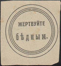 1917 1917(?) г. Разм. 44 х 44 мм. Одноцветная печать на плотной зеленоватой бумаге. В центре в круглой рамке из четырех концентрических окружностей диаметром 36 мм текст в две строки: «Жертвуйте бедным».