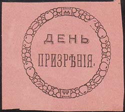 1917 1917(?) г. Разм. 49 х 44 мм. Одноцветная печать на розоватой бумаге. В центре в декоративной рамке с растительным орнаментом диаметром 36 мм текст в две строки: «День призрения».