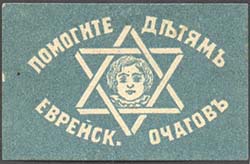 1914 1914(?) г. Разм. 51 х 33 мм. Одноцветная печать на белой бумаге. На сплошном фоне в центре шестиконечная звезда с головой ребенка в центре. Сверху полукругом текст: «Помогите детям». Внизу полукругом продолжение текста: «Еврейск[их]. очагов».