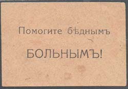 1914 1914(?) г. Разм. 47 х 32 мм. Одноцветная печать на серо-желтой бумаге. В центре текст в две строки: «Помогите бедным больным!».