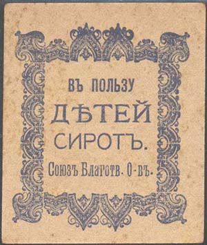 1915 1915(?) г. Разм. 57 х 68 мм. Одноцветная печать на желтоватой бумаге. В декоративной рамке с орнаментом текст в четыре строки: «В пользу детей сирот. Союз Благотв[орительных]. О-в».