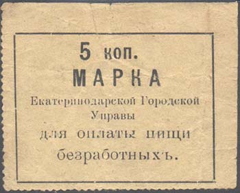 1915 1915(?) г. Разм. рамки 49 х 37 мм. Одноцветная печать на желто-серой бумаге. Зубц. 11. В прямоугольной рамке текст в пять строк: «5 коп. Марка Екатеринодарской Городской Управы для оплаты пищи безработных».