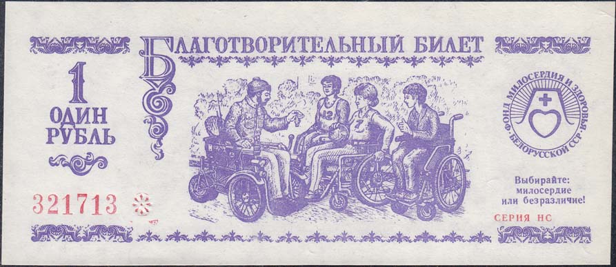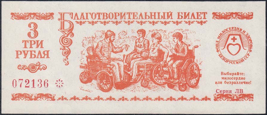 1989 1989(?) г. Разм. 150 х 64 мм. Одноцветная двухсторонняя печать на белой бумаге переменной плотности с имитацией ВЗ. На лицевой стороне в центре грумма инвалидов на колясках. Сверху текст: «Благотворительный билет». Слева номинал и номер. Справа эмблема, девиз фонда и серия. На оборотной стороне в центре обращение к жертвователю. Сверху текст: «Благотворительный билет». Слева эмблема и реквизиты фонда. Спрва номинал. Слева внизу выходные данные мелким шрифтом.