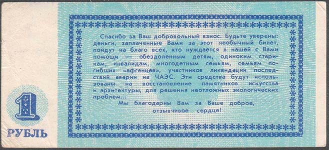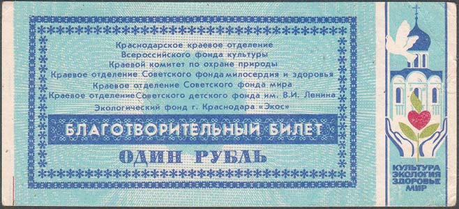 1988 1988(?) г. Листок разм. 110 х 49 мм. Многоцветная двухсторонняя печать на белой бумаге. На лицевой стороне в двойной декоративной рамке разм. 80 х 42 мм в центре текст: «Благотворительный билет». Сверху текст в семь строк: «Краснодарское краевое отделение Всероссийского фонда культуры Краевой комитет по охране природы Краевое отделение Советского фонда милосердия и здоровья Краевое отделение Советского фонда мира Краевое отделение Советского детского фонда им. В.И.Ленина Экологический фонд г. Краснодара «Экос»». Внизу номинал в виде текста. Справа храм, голубь и эмблема. В правом нижнем углу текст в четыре строки: «Культура экология здоровье мир». На оборотной стороне в двойной прямоугольной декоративной рамке разм. 80 х 42 мм в центре текст в двенадцать строк: «Спасибо за Ваш добровольный взнос. Будьте уверены: деньги, заплаченные Вами за этот необычный билет, пойдут на благо всех, кто нуждается в нашей с Вами помощи – обездоленным детям, одиноким старикам, инвалидам, многодетным семьям, семьям погибших «афганцев», участникам ликвидации последствий аварии на ЧАЭС. Эти средства будут использованы на восстановление памятников архитектуры, для решения неотложных экологических проблем... Мы благодарны Вам за Ваше доброе, отзывчивое сердце!». В левом нижнем углу номинал.