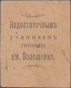 1917 1917(?) г. Разм. 47 х 58 мм. Одноцветная печать на желто-серой бумаге низкого качества. В центре текст в четыре строки: «Недостаточным ученикам гимназии им. Волошенко». Сверху и снизу растительный орнамент.