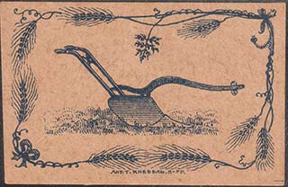 1914 1914(?) г. Разм. 54 х 35 мм. Одноцветная печать на сероватой бумаге. В декоративной рамке из колосьев пшеницы в центре плуг. Внизу под рамкой мелким шрифтом выходные данные: «Лит. Т. Киббель, П-ГР».
