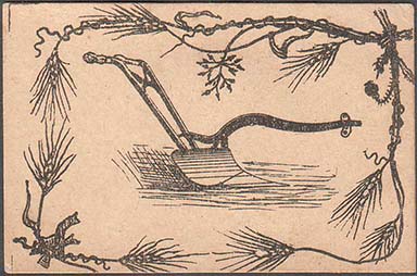 1915 1915(?) г. Разм. 65 х 42 мм. Одноцветная печать на белой бумаге. В декоративной рамке из колосьев пшеницы в центре плуг.