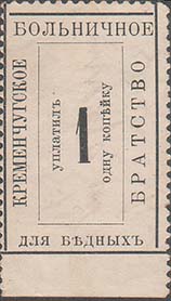 1915 1915(?) г. Разм. 66 х 48 мм. Одноцветная печать на бумаге различных цветов. Зубц. 11 1/2. Разм. рамки 24 х 37,5 мм в центре в прямоугольной рамке разм. 13 х 28 мм номинал и вертикально текст: «Уплатить ... копейки». По периметру между рамками текст: «Кременчугское Больничное Братство для бедных».