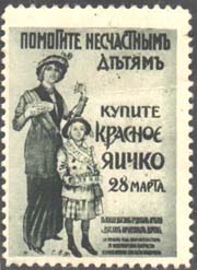 1914 1914(?) г. Разм. 26 х 35 мм. Зубц. 11. Двухцветная печать на сероватой бумаге. Дама с девочкой. Сверху текст в две строки: «Помогите несчастным детям». Справа продолжение текста в четыре строки: «Купите красное яичко. 28 марта». Внизу мелким шрифтом текст в пять строк: «В пользу детских трудовых артелей и детских ночлежных домов, состоящих под покровительством ее императорского Высочества Великой Княгини Елизаветы Федоровны».