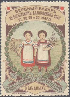 1910 1910(?) г. Разм. рис. 36 х 50 мм. Многоцветная печать на белой бумаге. Зубц. 12 1/2. С клеем. В центре в обрамлении венка двое детей. Сверху текст в три строки: «Вербный базар в Российском Благородном собр[ании]. 27, 28,29 и 30 марта». Внизу на ленте текст в две строки: «В пользу городских попечительств о бедных». Справа внизу под рисунком мелким шрифтом выходные данные: «Лит. Ж. Шеньель».
