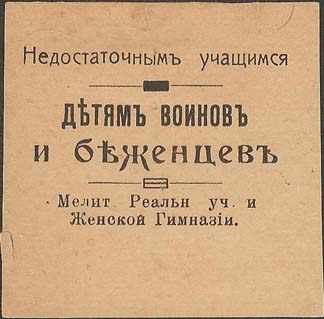 1915 1915(?) г. Разм. 51 х 51 мм. Одноцветная печать на сероватой бумаге. В центре текст в пять строк: «Недостаточным учащимся детям воинов и беженцев Мелит[опольских]. Реальн[ого]. Уч[илища]. И Женской Гимназии». Между строками текста декоративные элементы.