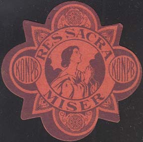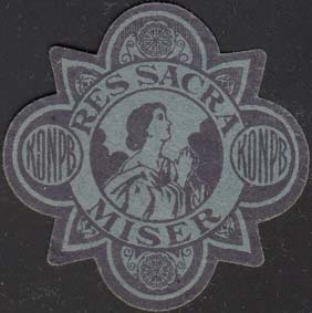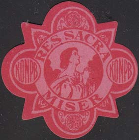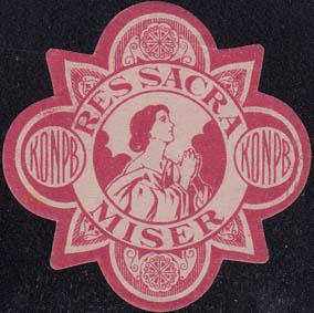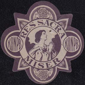 1915 1915 г. 25.04.2015 Виньетка в виде щитка сложной формы. В центре в двойной круглой раке фигура молящейся женщины. По периметру между рамками текст на латыни: "Res sacra miser". Сверху и снизу декоративные элементы.