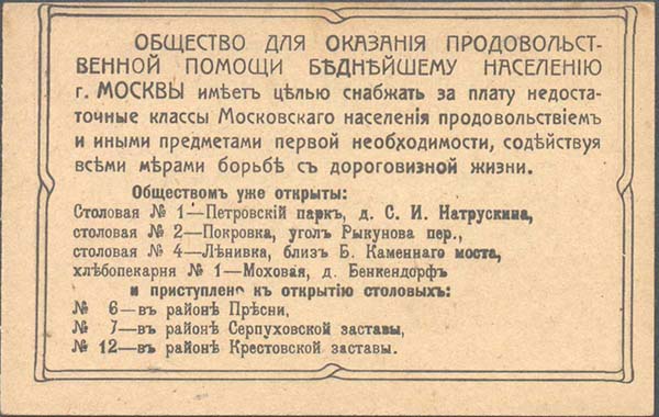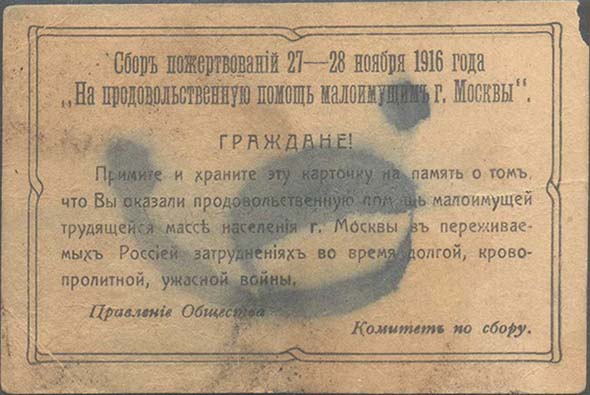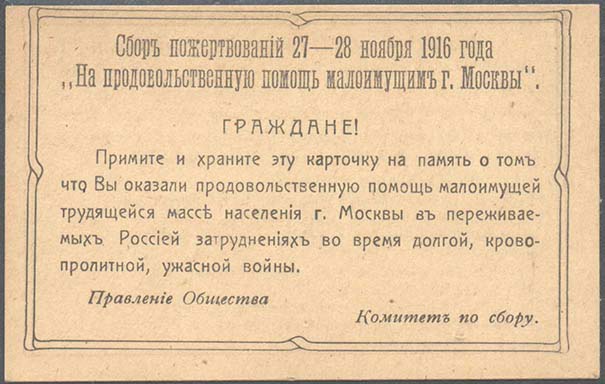 1916 1916 г. 27.-28.11.1916 г. Городской сбор. Одноцветная печать на толстой желтоватой плотной бумаге. На лицевой стороне в рамке разм. 93 х 58 мм сверху текст в две строки: «Сбор пожертвований 27-28 ноября 1916 года «На продовольственную помощь малоимущим г. Москвы»». Ниже текст в восемь строк: «Граждане! Примите и храните эту карточку на память о том что Вы оказали продовольственную помощь малоимущей трудящейся массе населения г. Москвы в переживаемых Россией затруднениях во время долгой, кровопролитной, ужасной войны. Правление общества. Комитет по сбору». На оборотной стороне в рамке разм. 93 х 58 мм сверху текст в семь строк: «Общество для оказания продовольственной помощи беднейшему населению г. Москвы имеет целью снабжать за плату недостаточные классы Московского населения продовольствием и иными предметами первой необходимости, содействуя всеми мерами борьбе с дороговизной жизни. Обществом уже открыты: Столовая №1 – Петровский парк, д. С.И.Натрускина, столовая №2 – Покровка, угол Рыкунова пер., столовая №4 – Ленивка, близ Б[ольшого]. Каменного моста, хлебопекарня №1 – Моховая, д. Бенкендорф и приступлено к открытию столовых: №6 – в районе Пресни, №7 – в районе Серпуховской заставы, №12 – в районе Крестовской заставы».